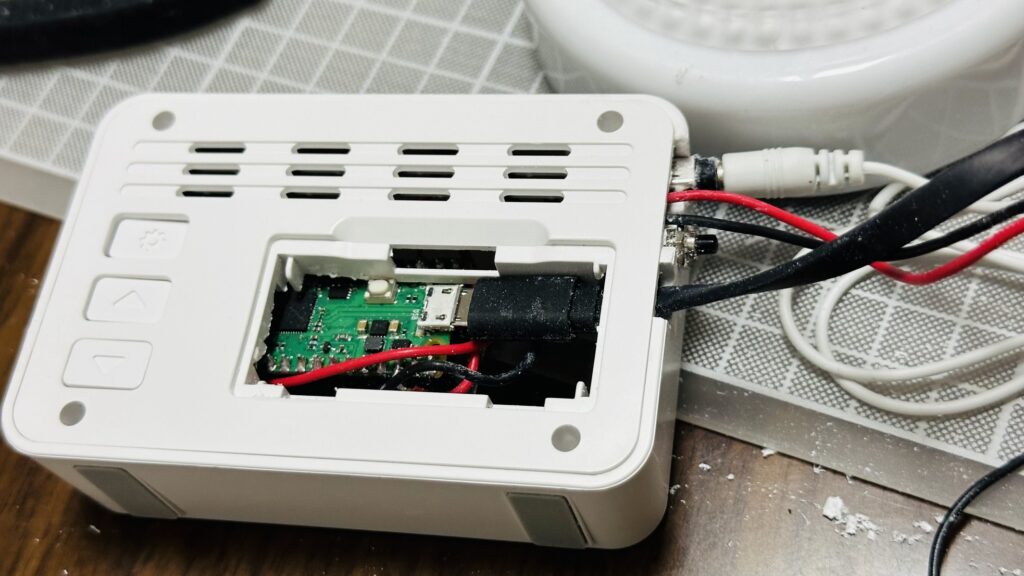 ちょっと不格好だけどもともとある壁掛け用の穴から配線を引き出してこれをAボタンのピンとグランドにつなぐ(プルアップしているので)